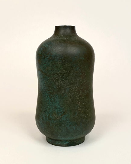 Verdigris-patinated bronze vase by an unidentified artisan, Japan, mid-20th C. Includes the original wooden presentation box.